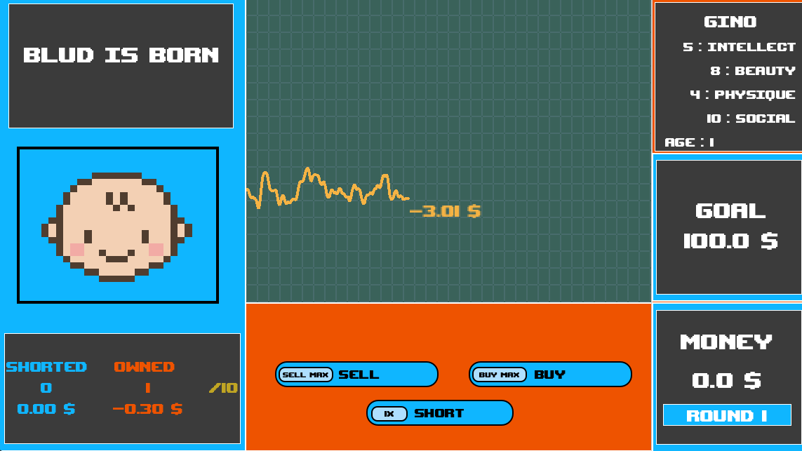 Hier ist unsere Submission zum HTL Inoweek Gamejam. Bludborn, das Lebenssimulation mit Börsenmechaniken kombiniert. Anstatt in Firmen zu investieren, investieren Spieler in Babys, deren Lebensverlauf ihren Wert bestimmt.